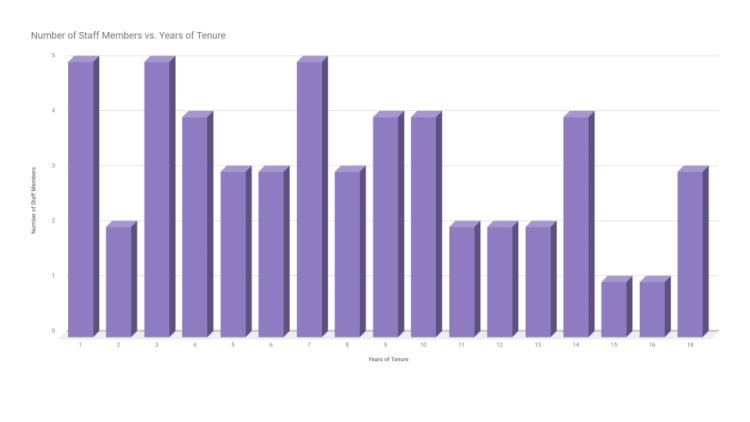 The school has a very good rate of retention, with many staff members choosing to stay with us for many years, and this is why we have been able to cultivate a strong and unique school culture. This chart shows the number of staff at our school and their years of tenure. For example, we have three staff members who have been with the school for 18 years, and the vast majority of our staff members have been at the school for more than five years. This makes for a very stable and safe environment for learning.